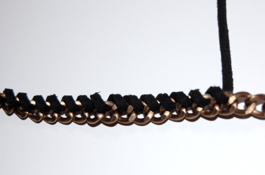 5) And keep on repeating. Easy enough! You’re just weaving the cord in and out through the links. Be sure to keep your chain in one direction; this will make it easier for you to go along the chain with your cord. (I used a flash in the photographs from here on in, so you can see the black cord better!)