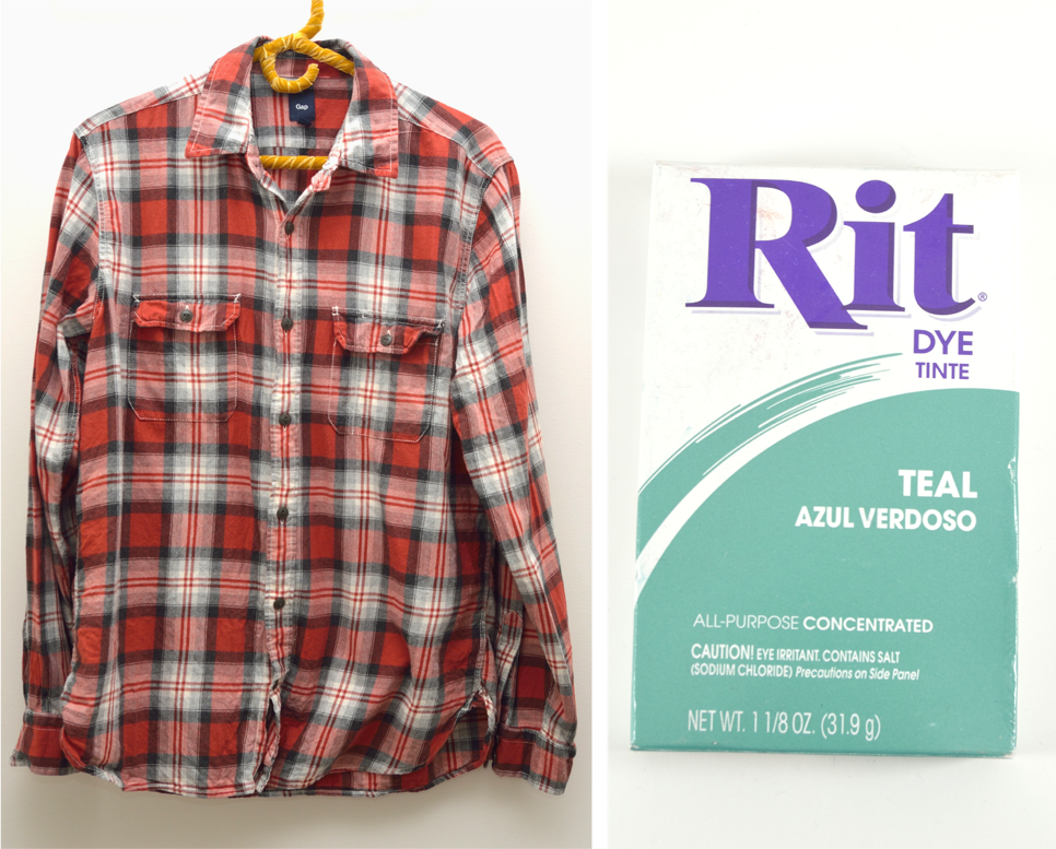 Quick, easy, and can be done in an afternoon. I used a thrifted mens’ flannel (by Gap and purchased from Goodwill for a few bucks) and teal dye. Of course, you can use any color you’d like. This would work better with a plaid shirt that has white incorporated into the print, in order to let the dye really pop.