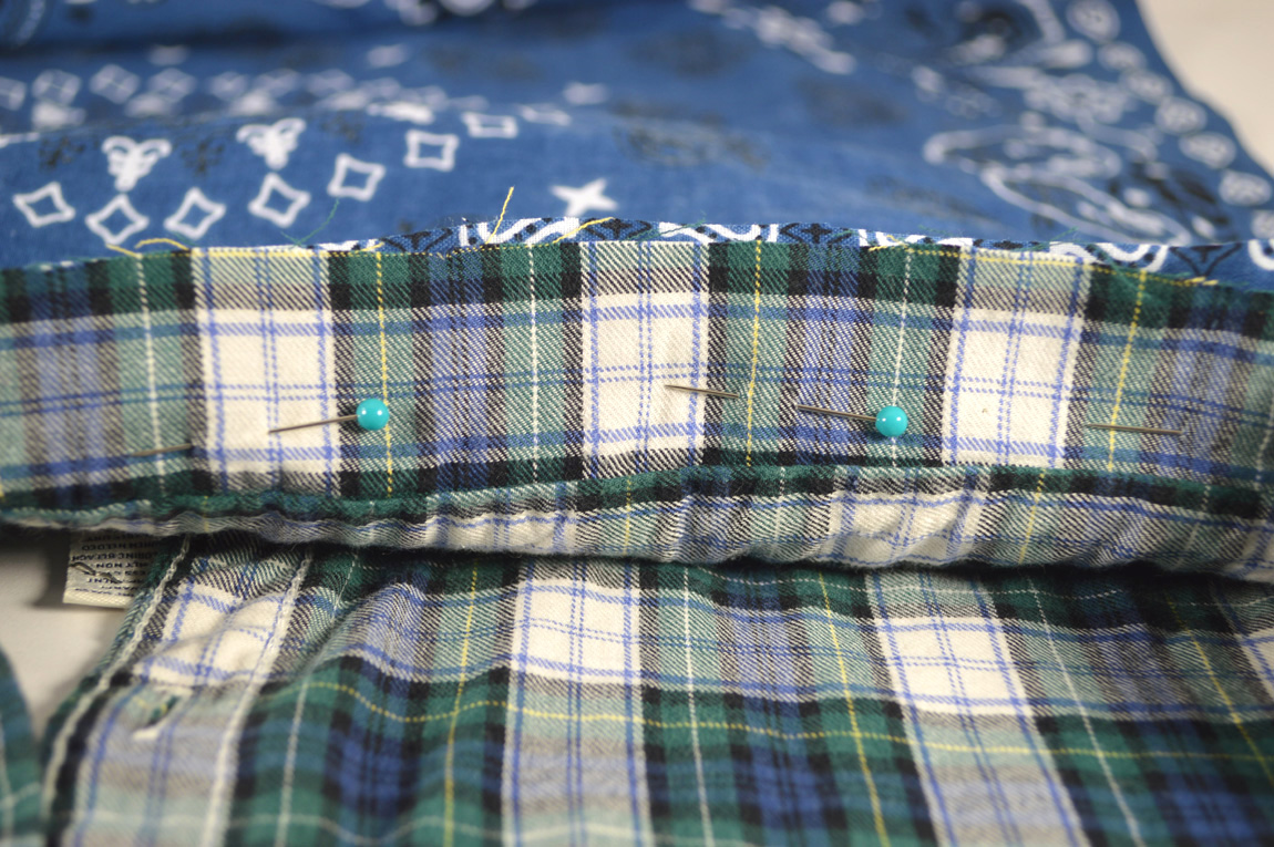 7) Line up the edge of the plaid fabric to the top of the bandanna. Here, the “right” side of the plaid shirt is facing the “right” side of the bandanna. Pin in place.