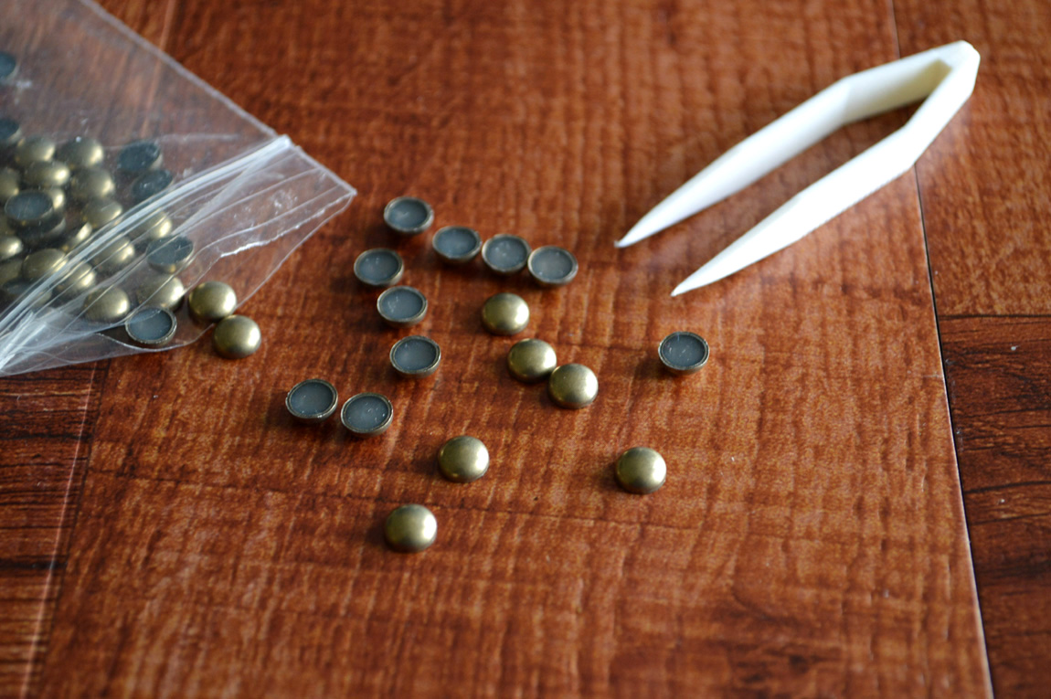 4) If you’d like, glue an iron on stud into each hole. Iron on studs have flat backs, making them ideal for this project. I happened to have brass iron on studs from M&J Trimming on hand, which also happened to fit perfectly!