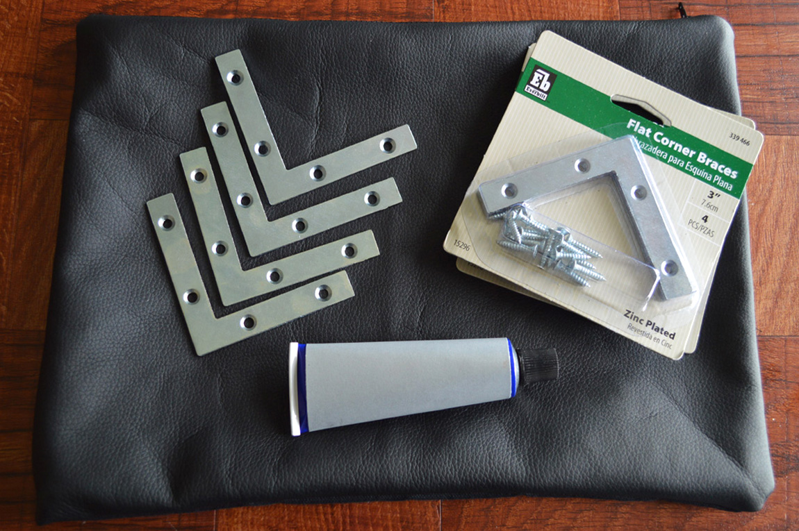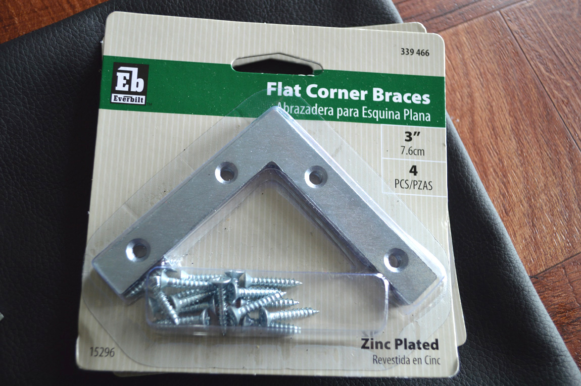 Metal braces are available in different sizes – I used 3″ zinc plated braces, which I purchased at Home Depot. They were $3.27 for each pack of 4. They are normally used for adding support and reinforcement for flat surface right angles, but apparently make a great embellishment, too.