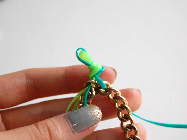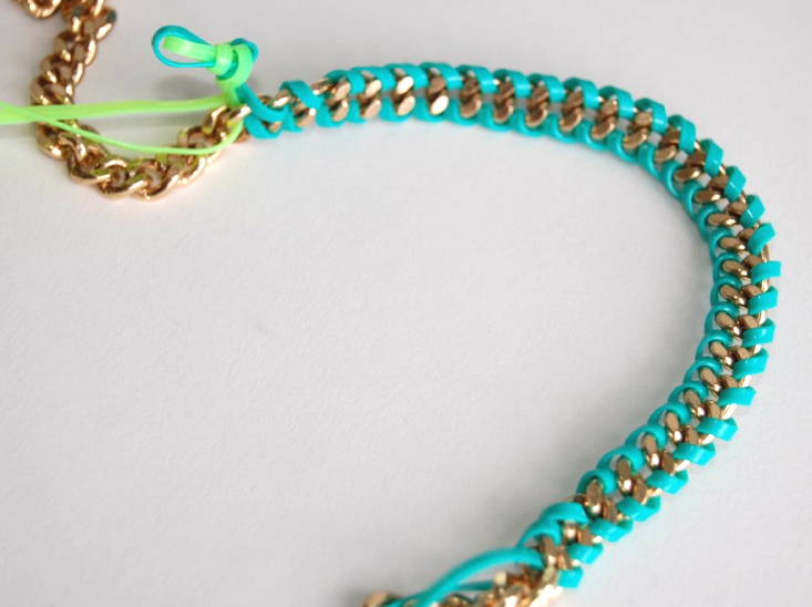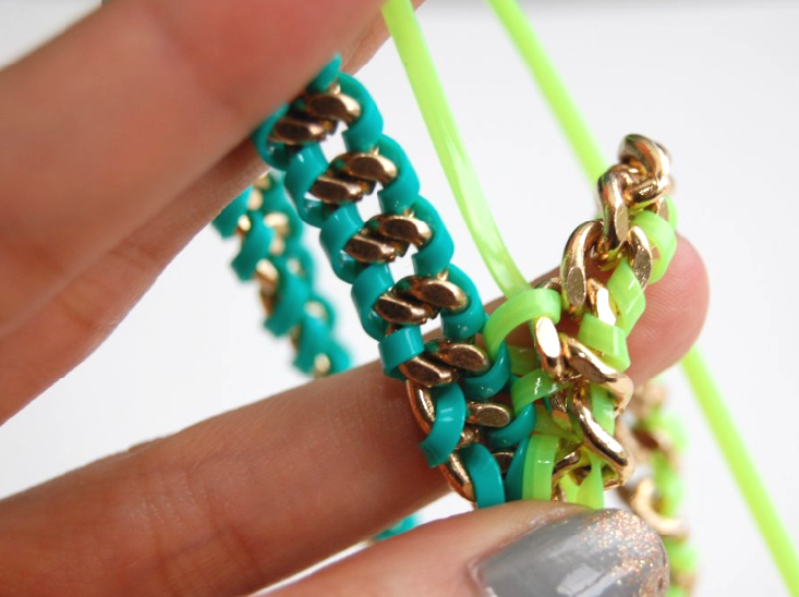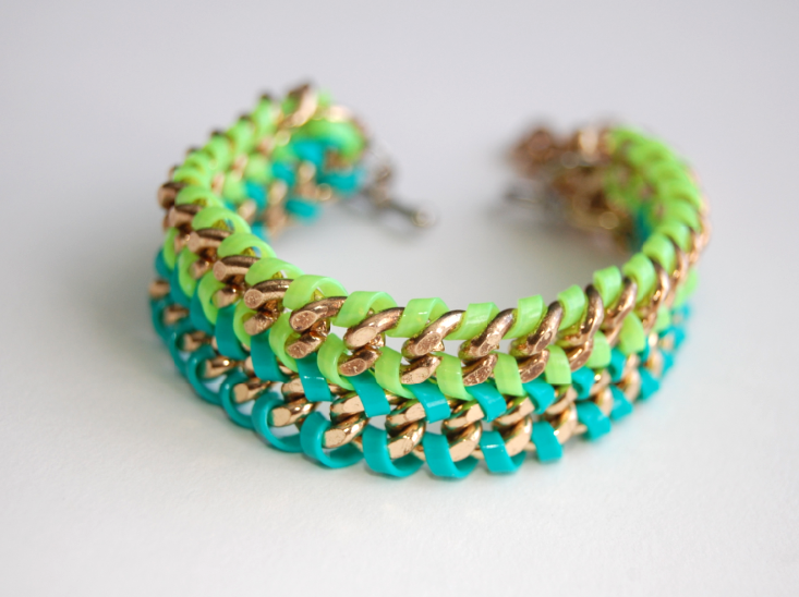 This project brings back memories, in more than one way. 1) I loved lanyard when I was a kid, and I clearly remember making sooo many keychains and bracelets. 2) This DIY reminds me of S&P’s first ever project, the Braided Chain Bracelet, from last summer. And 3) My entire bedding set during my Freshman year of college were these exact colors. My comforter was reversible neon green and bright blue, and I even had hangers and towels in the same colors. By the time I graduated I was more into the blacks and darker jewel tones, but I still can’t resist a good pop of color.