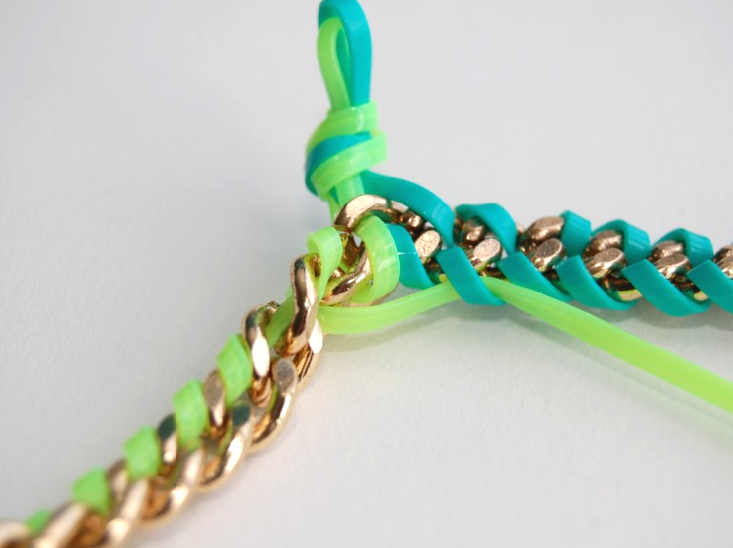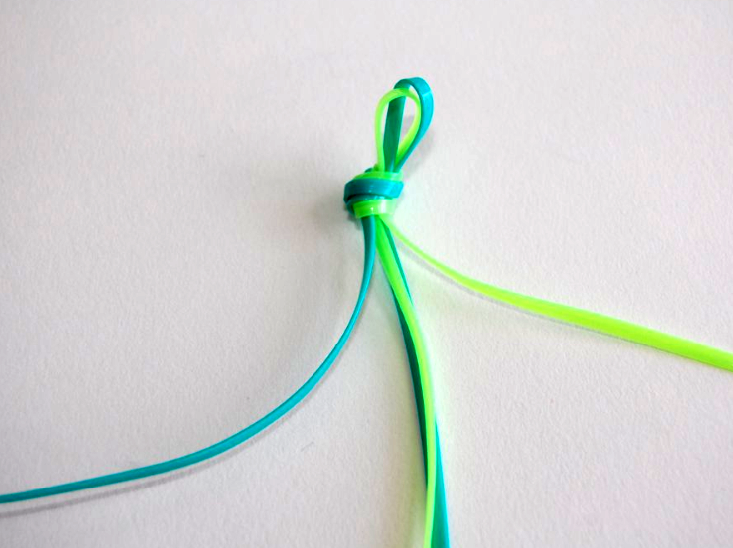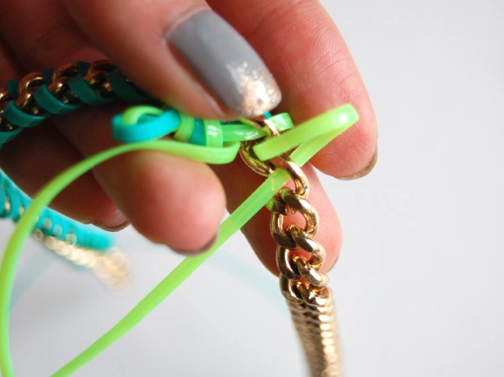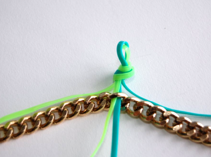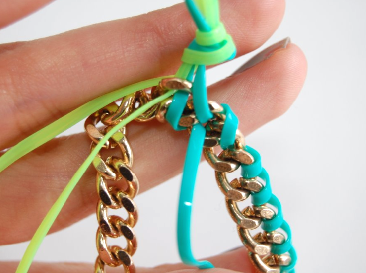 8) Keep repeating until you reach the end of the chain. You’ll want to pull tight like you did with the first strand, but make sure not to pull TOO tight. You’ll later be weaving the neon green through the blue lanyard, in order to connect the two sides.
