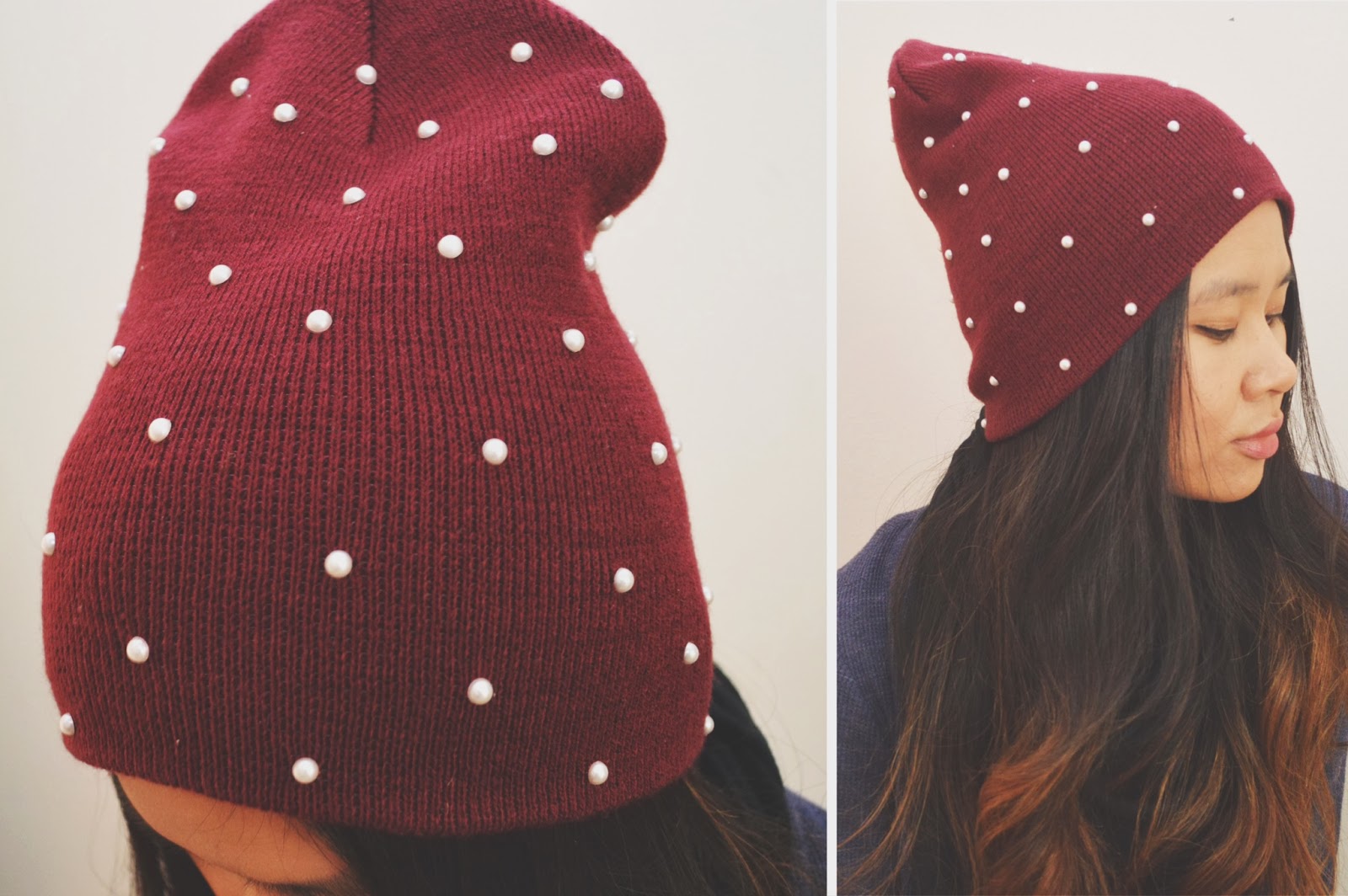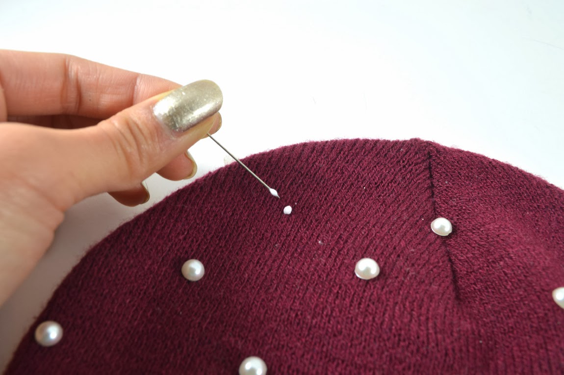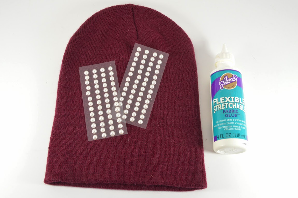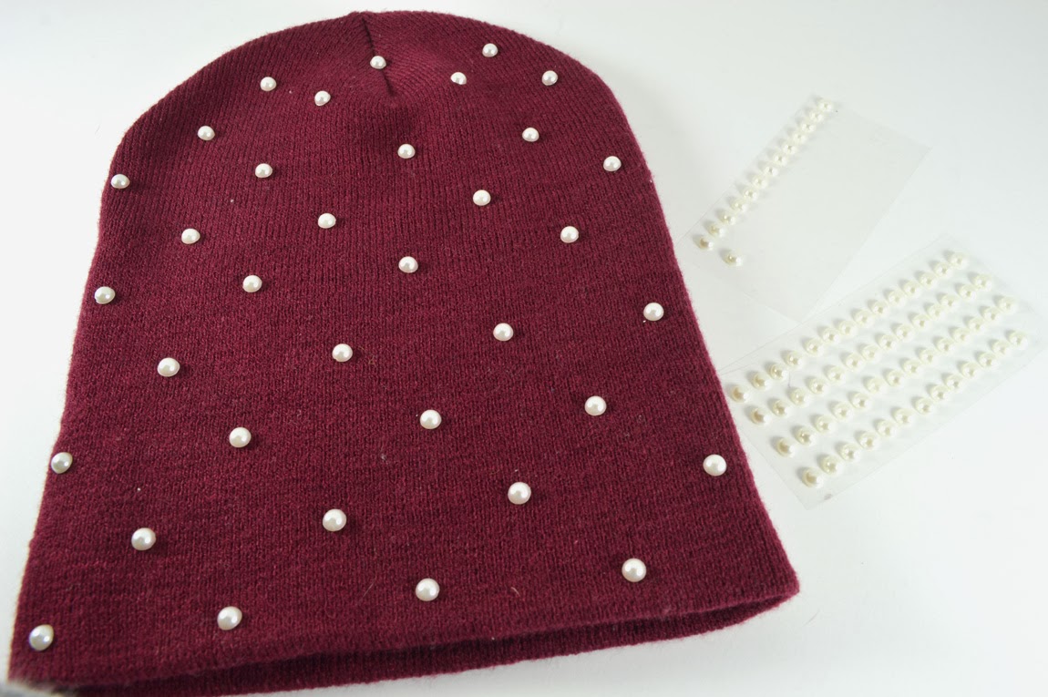Equal parts edgy and sweet, I’m head over heels in love with this week’s DIY! The pearl flat backs – which I found in the Scrapbook section of Michael’s – add a feminine touch to this maroon Men’s beanie I picked up at Target. Inspired by the classic vibe of pearl details, I knew I had to use them in a cool weather project.