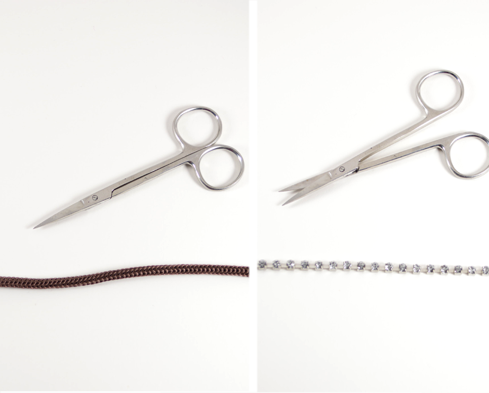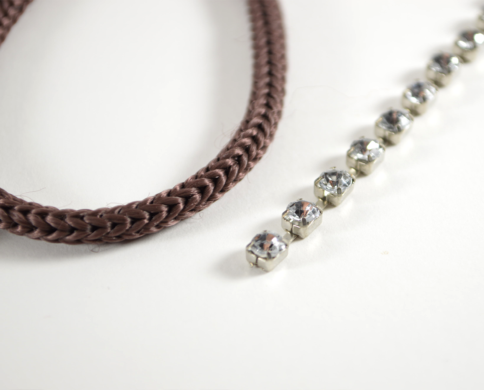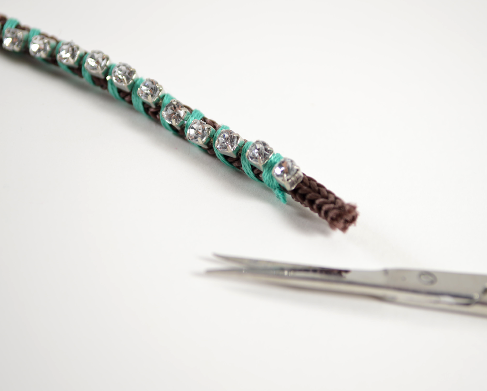 1) Cut a strand of cord measured to fit your wrist, plus about .5 in (1.27 cm). Cut a strand of rhinestone chain, measuring about the same length.