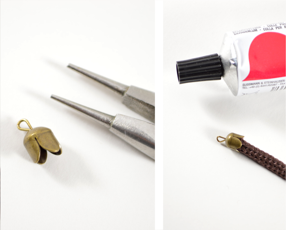3) Create a wire loop with the jewelry pliers. Apply some glue in the actual bead cap, and insert the rope/cord into the cap. Let dry a bit.