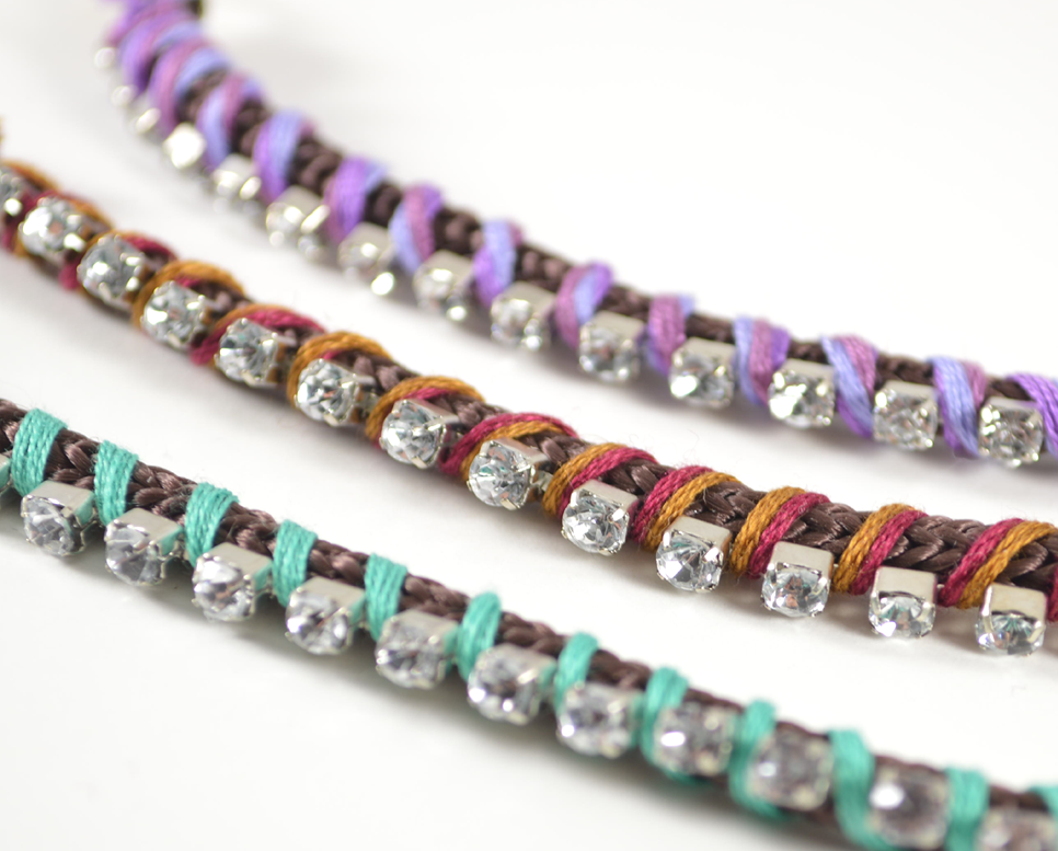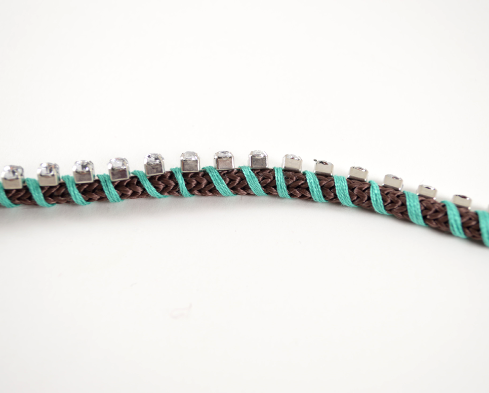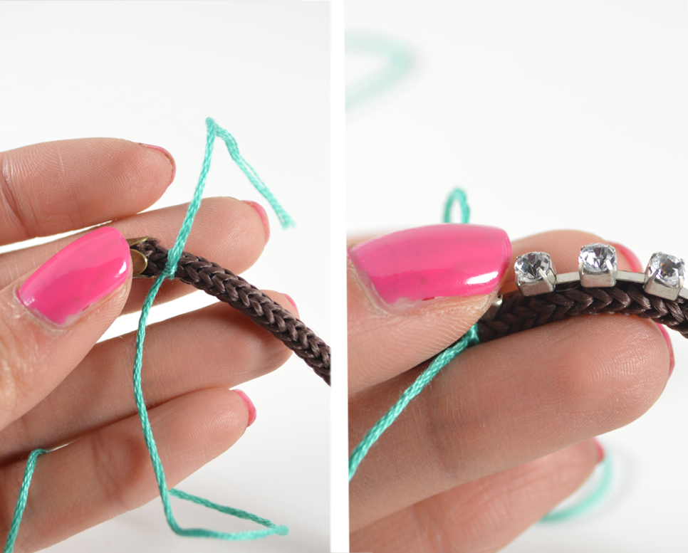 5) Begin wrapping the embroidery thread around the rhinestone chain, in between each stone. Wrap tightly, but not too tight.