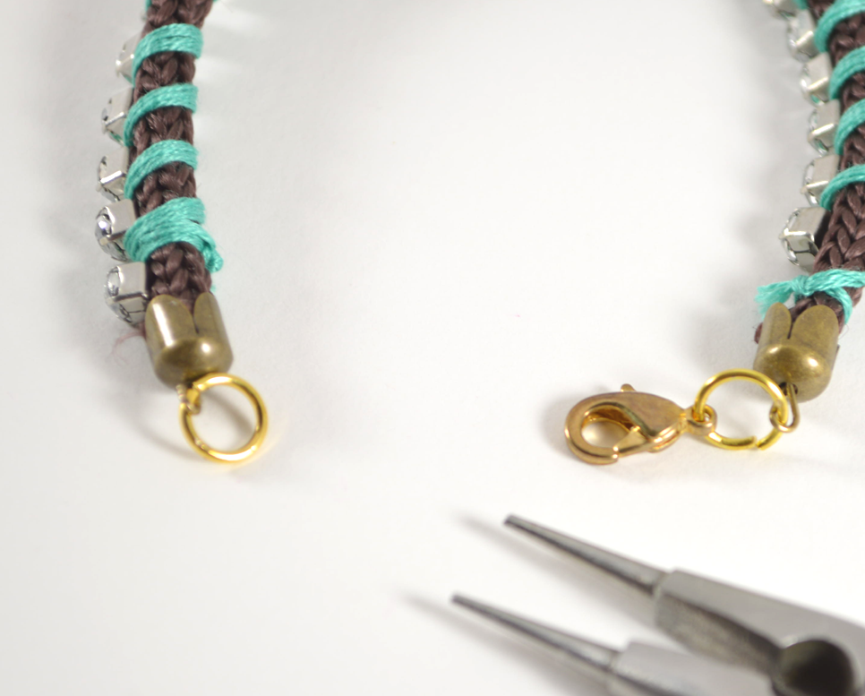 7) At the end, tightly tie the thread and cut the excess. Trim the rhinestone chain (if needed) and the cord so that there’s just a small bit left, just enough for another bead cap.