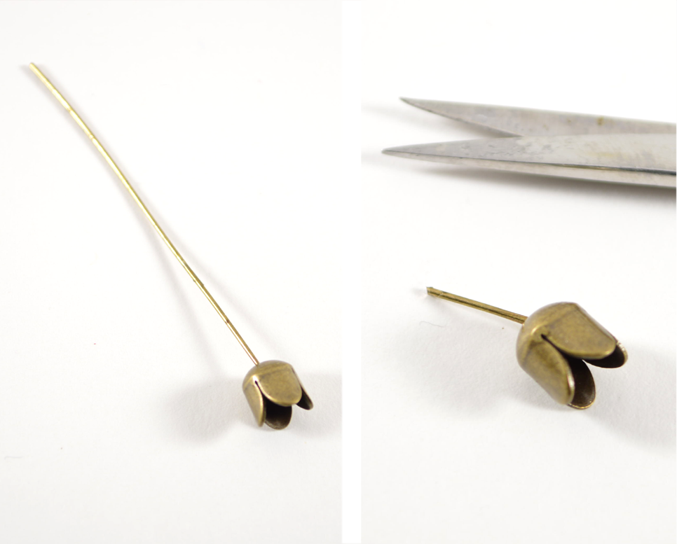 2) Insert a head pin through the bead cap, and trim down so that there’s just a small amount left.