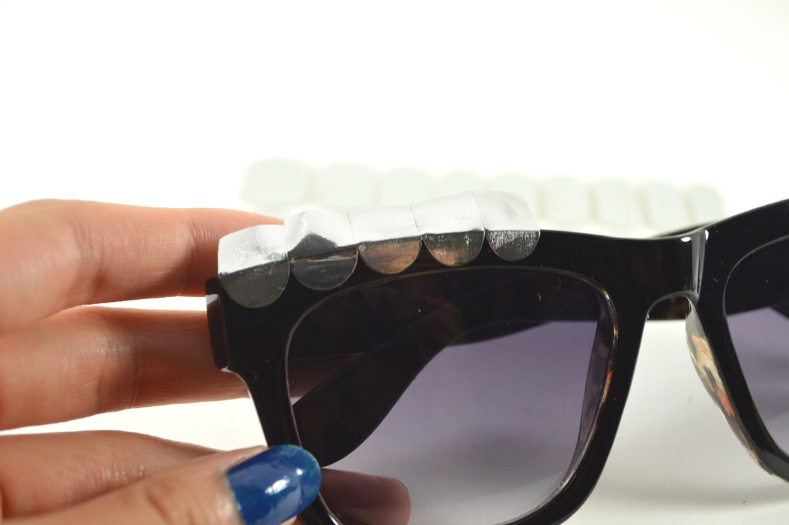 2) Carefully place the 5 biggest half strips on the edge of the shades. You might use less or more depending on the thickness of your sunglasses’ frames. Keep in mind that the strips will gradually become thinner, but it also might not be that noticeable (such as above!).