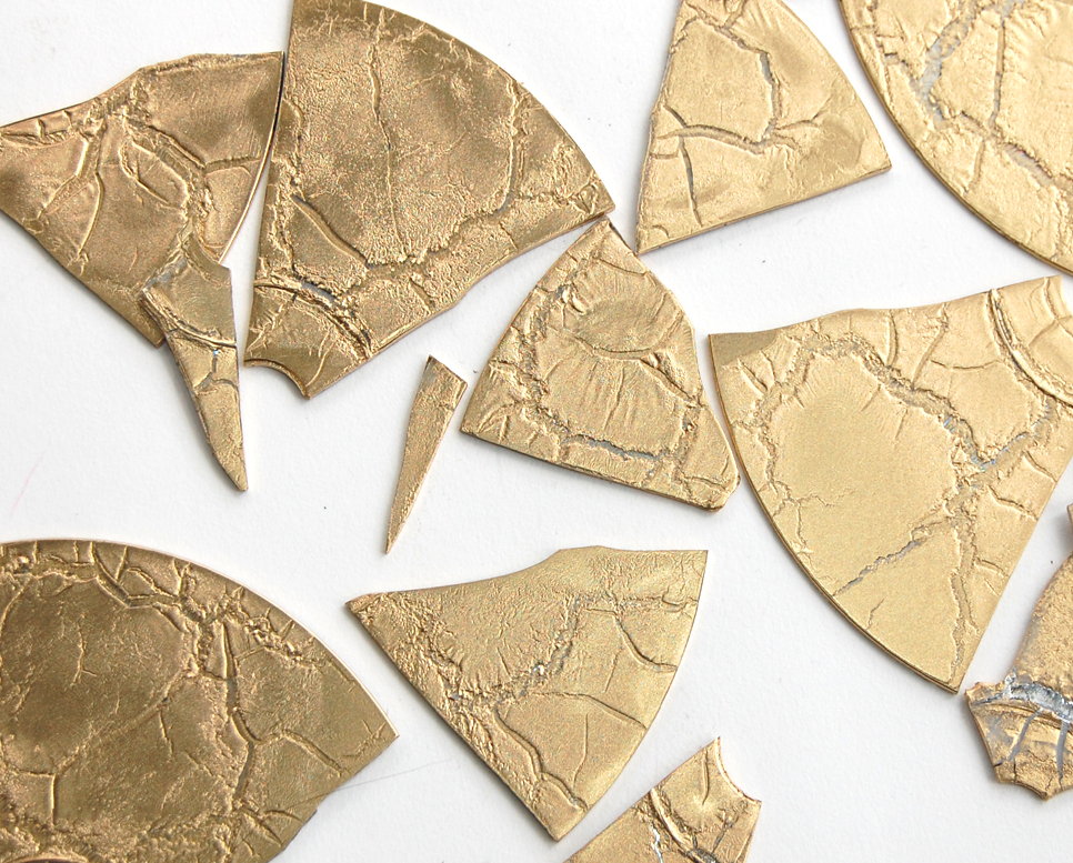 What I love about this DIY is that the crackled look totally wasn’t planned – but actually works, and creates the look of metal even more so than I had envisioned. If not metal, then definitely some kind of interesting material. I posted a picture of the spray painted CD shards on Instagram and asked my followers to guess what they were…I got everything from glass to faux croc pieces to paper/plastic plates. Even crackle nail polish!
