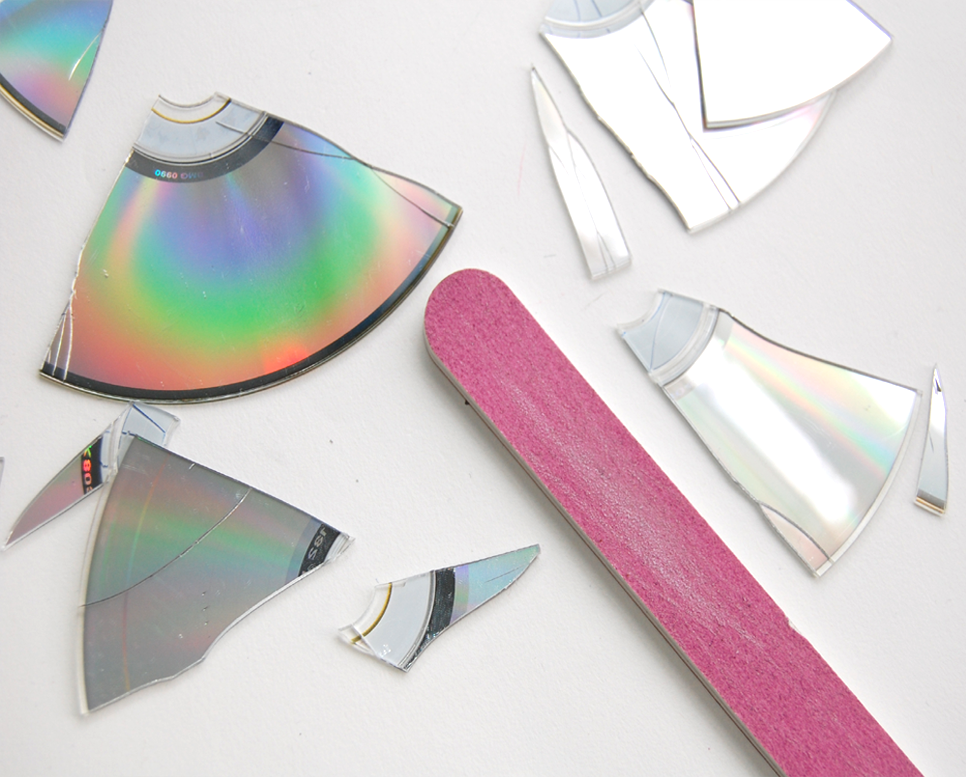 2) Close the ziplock bag, and carefully break the each CD. I simply took the CD with two hands and snapped them in half, then broke the larger pieces even further.BE VERY CAREFUL with this! If you can’t seem to break the CD with your own two hands, don’t strain yourself. Try taking a hammer to them on your driveway or sidewalk instead. Or ask someone else to break them a few times.