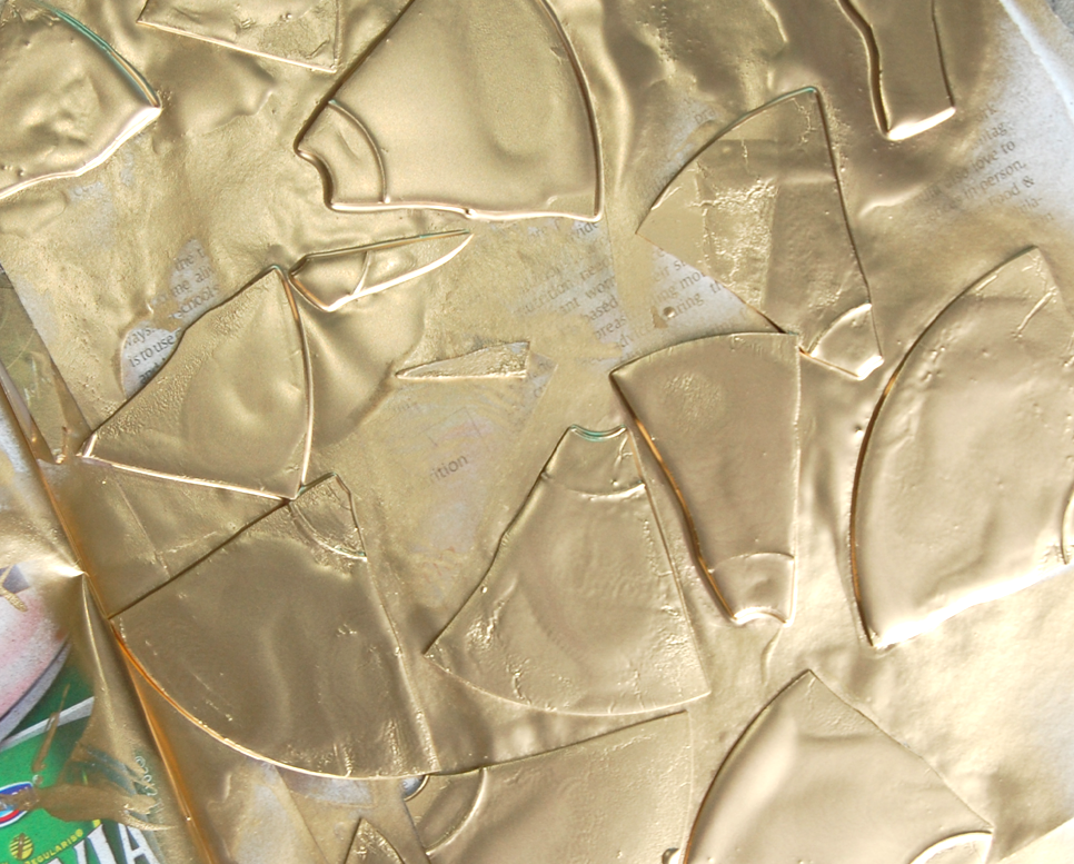 5) Lay the CD shards on top of magazines/newspaper, outside. Spray paint the pieces until they are completely covered. I held the can a little closer than suggested by the can, which I think may have had something to do with the pooling of paint and therefore the “crackling” look (which isn’t a bad thing – this ended up being way cooler looking than I had planned!)(If you’re wondering, I sprayed the BACK side of the CD pieces. In other words, the graphic on the CD was facing down.)