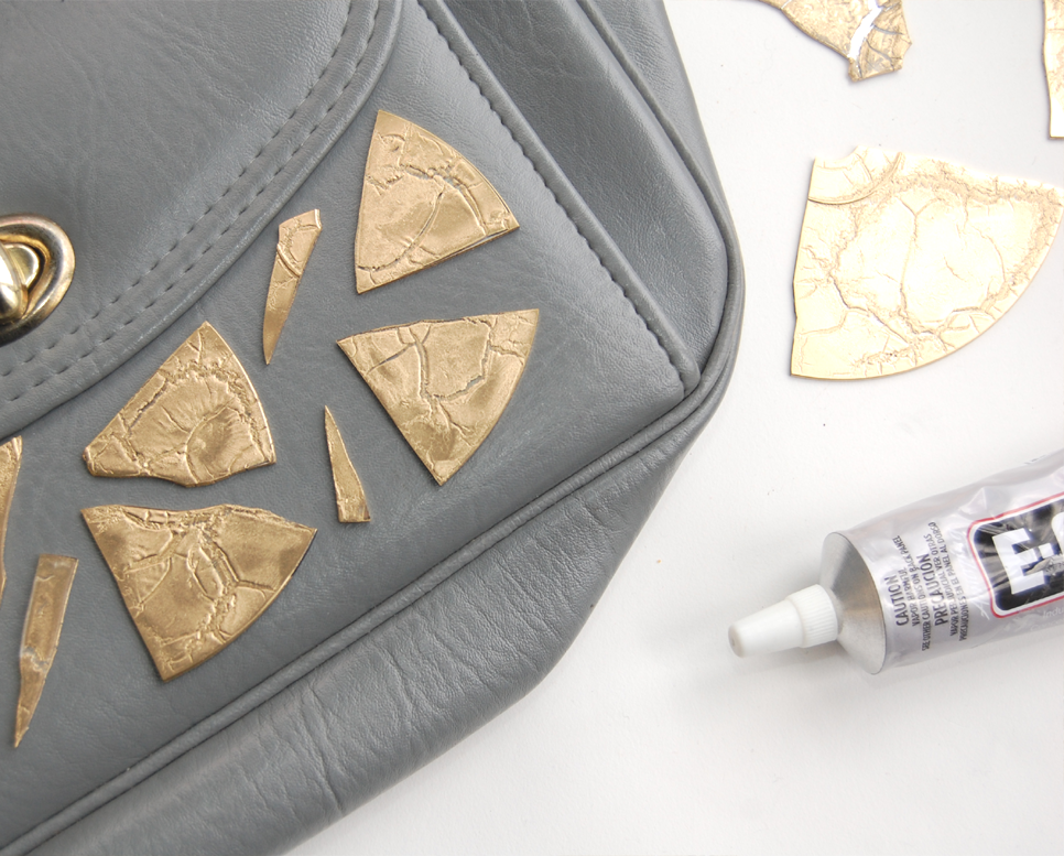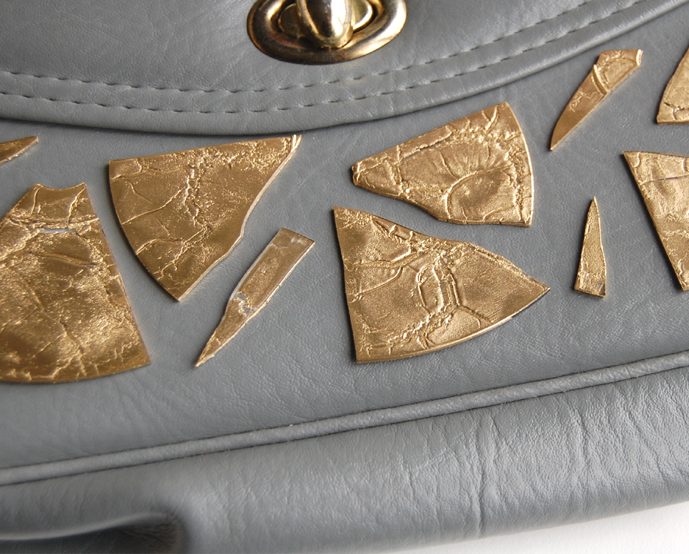 In the end, these metallic bits are really just broken CD’s – which I’m sure all of you have a ton of laying around. This project is great for dressing up an old purse, such as this gray one that I snagged at Goodwill for a few dollars.