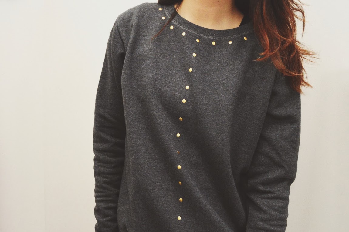 1) First, I added studs along the collar. In order to create some kind of symmetry, I added one at the very center. I used the sweatshirt’s middle fold as a guide!