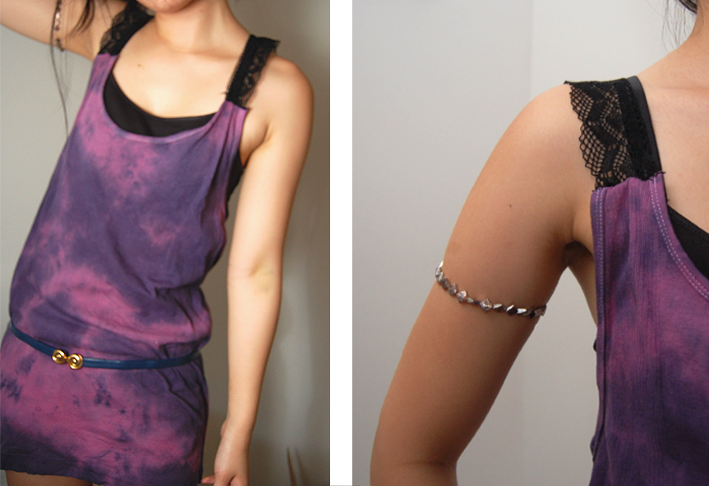 This is how mine ended up. I love the way the Navy Blue looks against the wine. Remember making that pleat in the middle of the strap (if needed?) – you can see it if you look closely at both straps.I wore it over a black tank top, a vintage blue waist belt, and even though you can’t see them – black denim shorts. The material is light enough for the summer, but still wearable for the fall. It’s a good thing I don’t have a boyfriend to steal white tank tops from, otherwise they’d all end up like this.