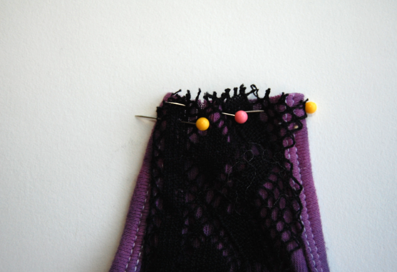 7) Pin the lace to the strap. If the strap is wider than your lace, you can always make a small pleat when you sew. What matter the most is that the right and left edges are sewn together (indicated by the yellow pins).