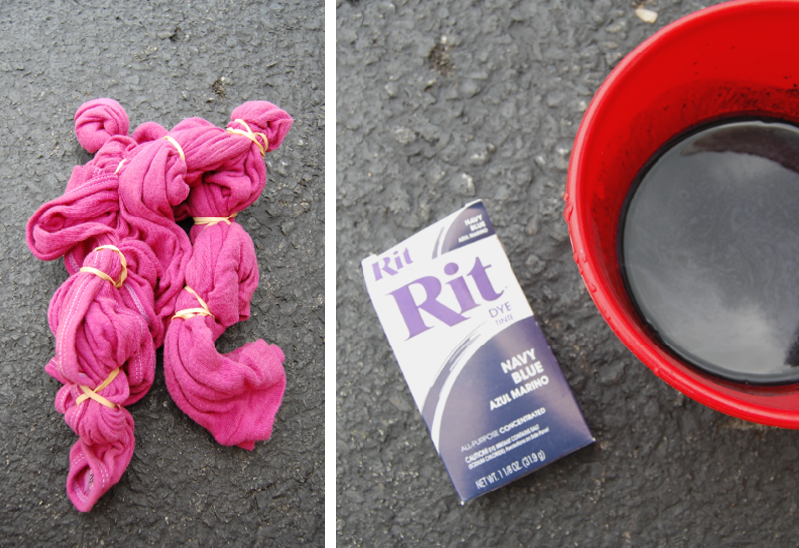 1) Head outside, prepare the brighter dye (in my case, Wine) in a big plastic tub. Submerge your top and let the dye really soak in. Don’t forget to wear those rubber gloves.Throw the top into the wash; a fairly short cycle should do.