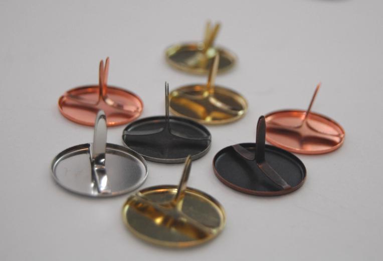 3) Carefully insert the brads and bend the prongs to secure them (below). If you’d like, use a little hot glue to further secure the prongs.