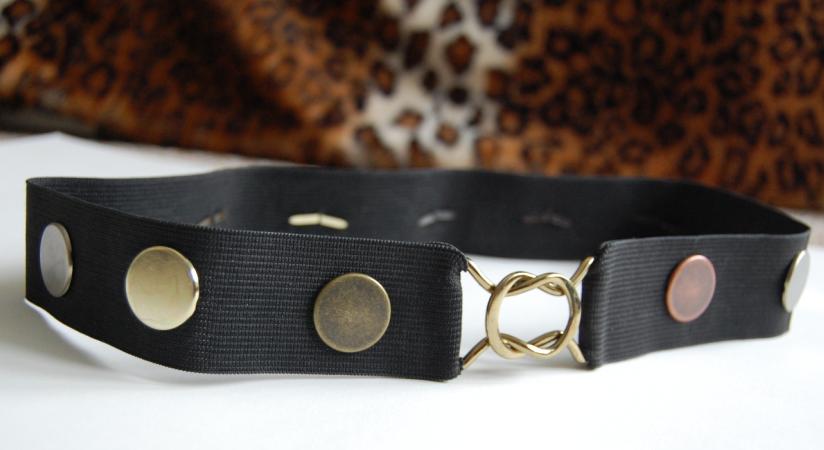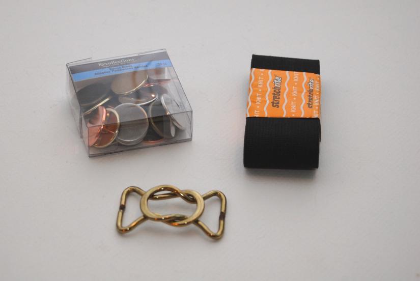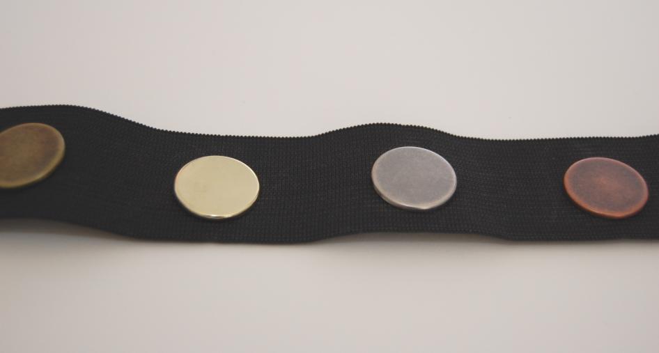 This project uses thick elastic and the least expected item for any kind of fashion DIY… scrapbooking brads. These are usually used to accent photographs & pages, and come in a wide variety of shapes, sizes and colors. I found these large circle brads in silver/gold/brass/copper, and used them to “stud” a waist belt made from sewing elastic.