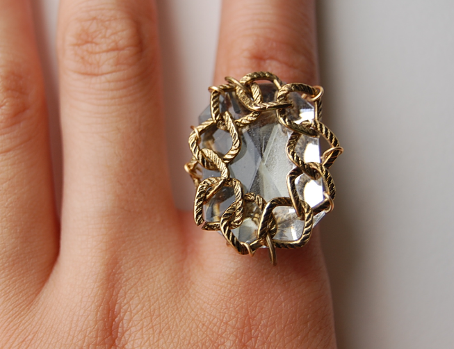 This project is (somewhat) inspired by the Harrison Ring by Dannijo, which is available at ShopZoeOnline.com for $155. I decided to make my own DIY statement ring with the same general concept as the $150+ original, using sew-on faceted gems.