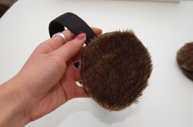 2) Hot glue the back of one circle, to the backside of one end of the headband. I made mine so that an inch of the headband was glued to the circle. (Tip: Before gluing anything down, try on the headband-fur combination to figure out proper/comfortable placement)