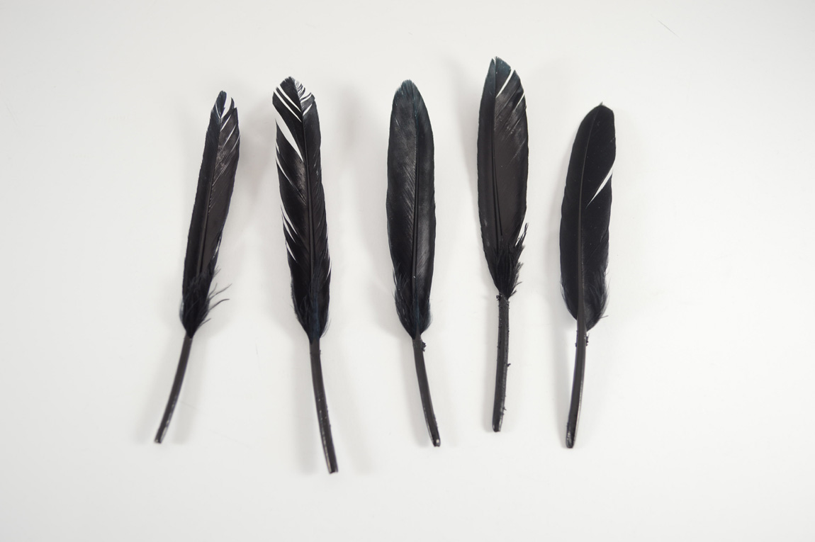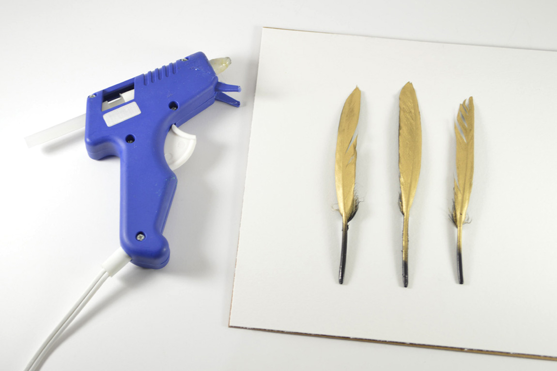 1) Spray paint your feathers. I’d recommend heading outside for this. I protected my surface with a large garbage bag. I held each feather (while wearing gloves) and spray painted them one by one.