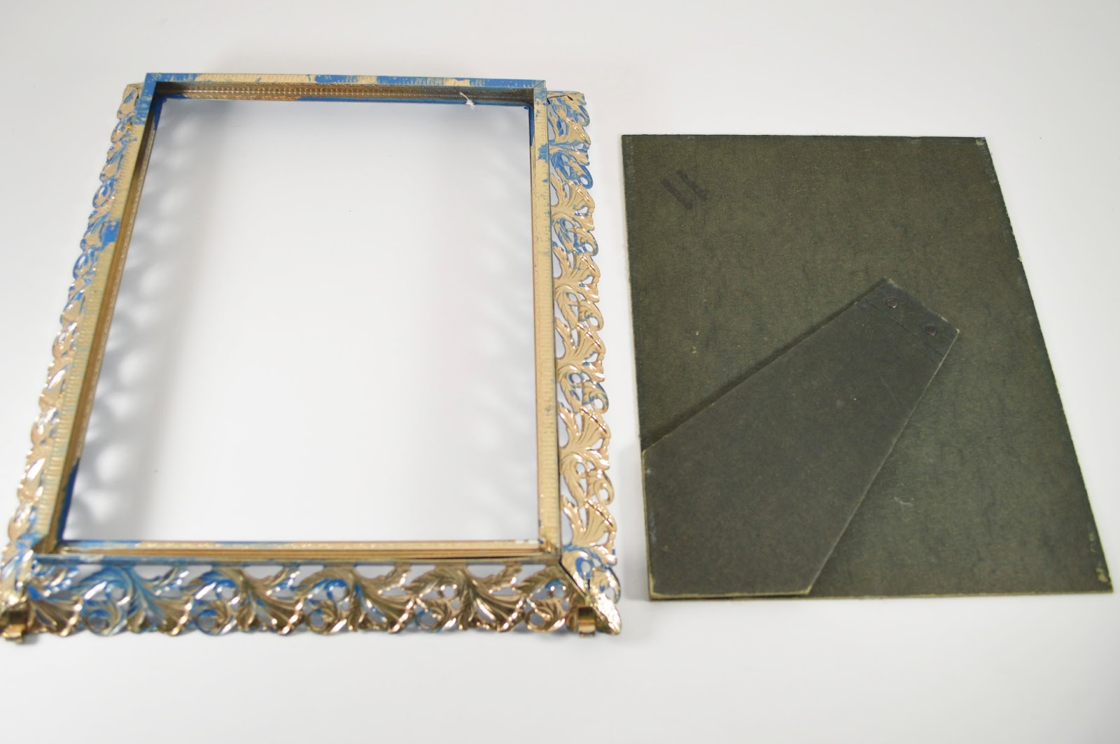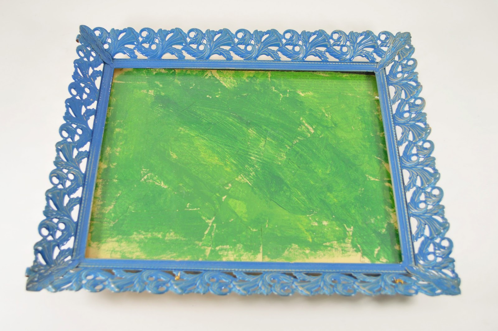 1) If you haven’t already, remove the frame’s inserts. Spray paint the frame, following the can’s directions.As you can tell from the pictures, my frame used to be gold – I had already spray painted it a few years ago. It used to be a prop for craft shows during my college years.