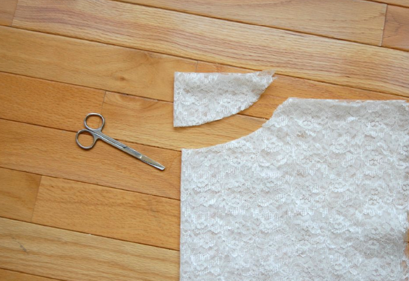3) Fold the shirt in half again, from left to right. Cut out your neckline in the top left hand corner. As always, don’t cut out too much too soon; you can always try the fabric on and trim accordingly.