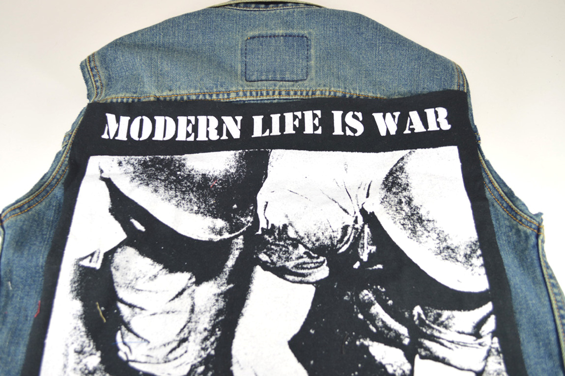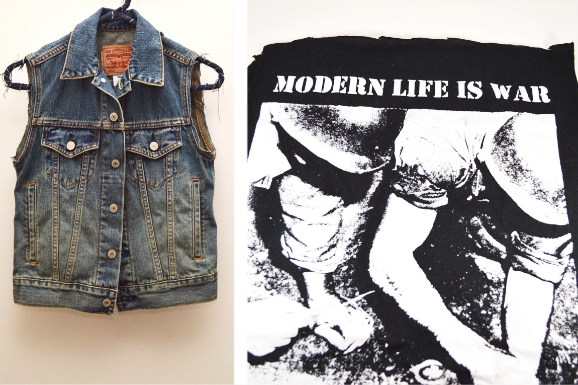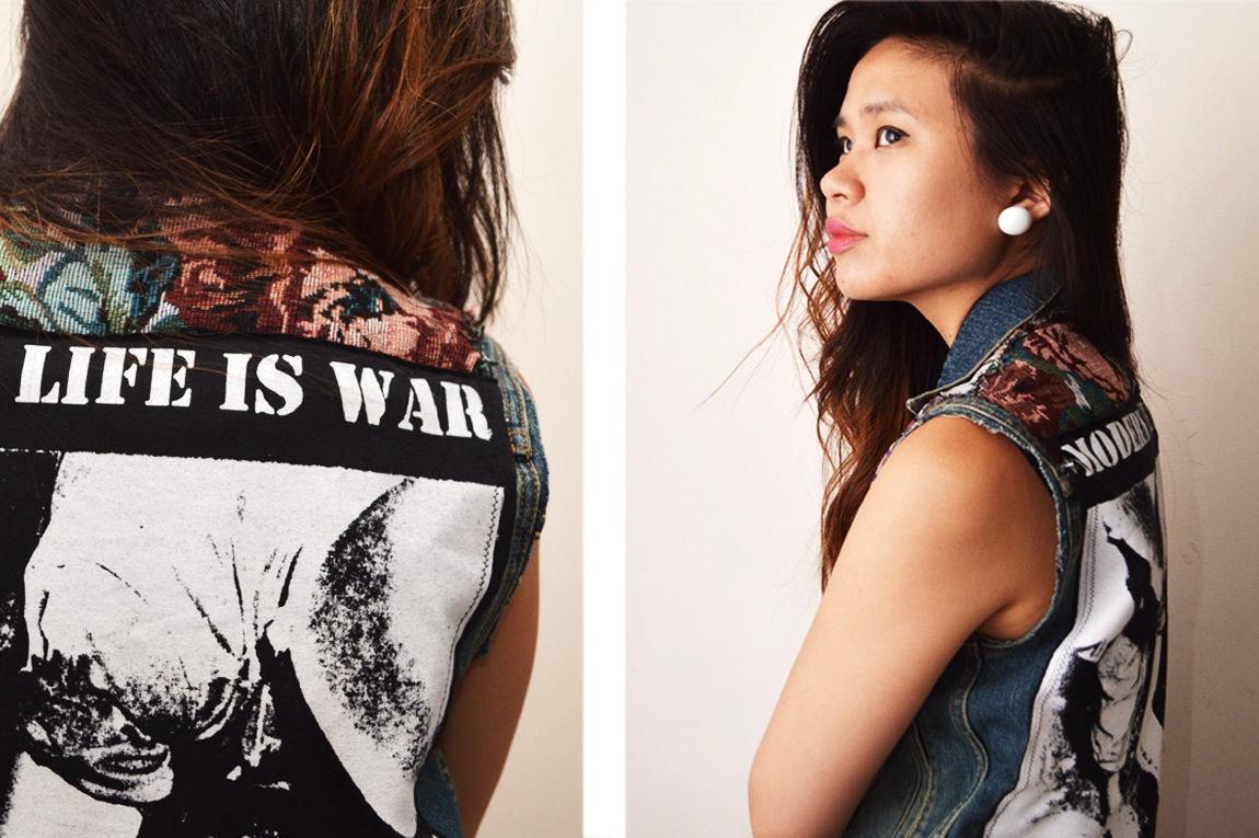 I combined some tapestry fabric (found at Jo-Ann Fabric & Craft Stores) with a hardcore band shirt (Modern Life is War). They were active until 2008 then made a comeback last year. I’ve owned this shirt for a while, but never really wore it much since it was too big for me. Thanks to a $10 Goodwill find (a Levi’s denim jacket) and some sewing, I was able to add some edginess to some floral granny fabric.