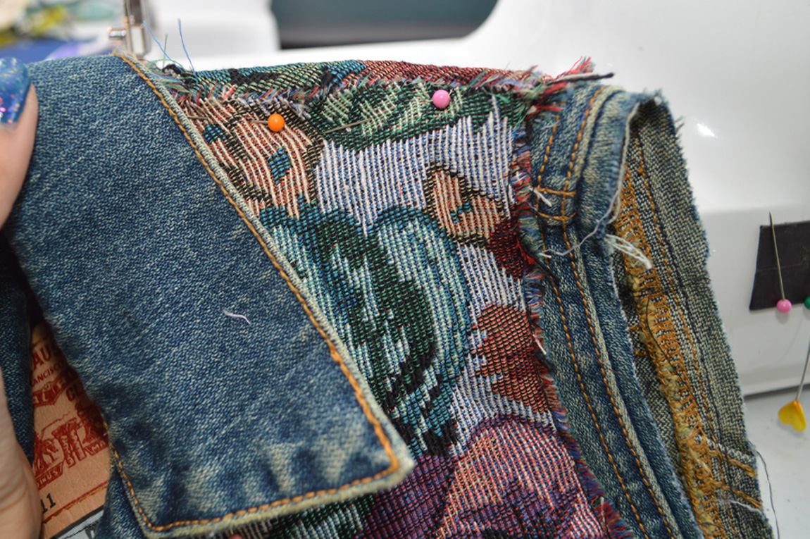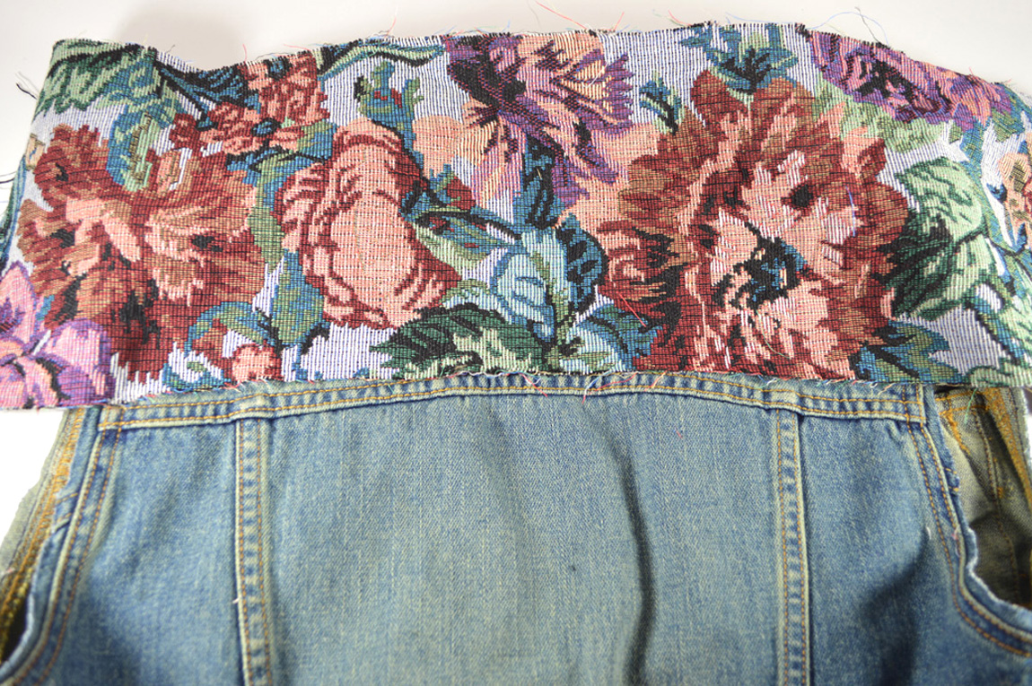 7) Lay the tapestry fabric back on the upper back panel, pinning in place. Cut the curve right under the collar, as shown above. This may be a little tricky, so take your time! If it’s not perfect, don’t stress too much – the vest’s collar will cover the cut edge of the fabric.