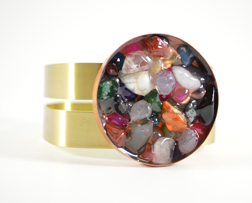 As of last autumn, the hardware store has become a new source of inspiration for me. I have quite a few projects lined up using odds and ends found at the hardware store, all of which are still fashion/home decor related. I’m excited to share them! Past hardware store related projects included the Wood Coaster Set and the Vinyl Tube Bracelets. Here’s yet another one: a bangle bracelet, embellished with a copper test cap filled with jewelry gel and stones. Copper test caps are used in sewage plumbing; this one cost about $1.50 at Home Depot.