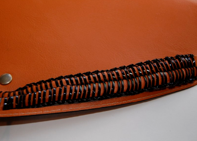 Sometimes, I look at things…and certain techniques used (as oppose to the actual item) jump out at me. I loved the stitched look in this clutch, and automatically thought of the black lanyard I have in my stash. I also thought back to the techniques I used in this Fur & Ribbon Scarf and Lanyard Double Chain Bracelet. I ended up weaving the lanyard like I did with the ribbon in the scarf, but connecting two of those weaves together like I did in the bracelet.