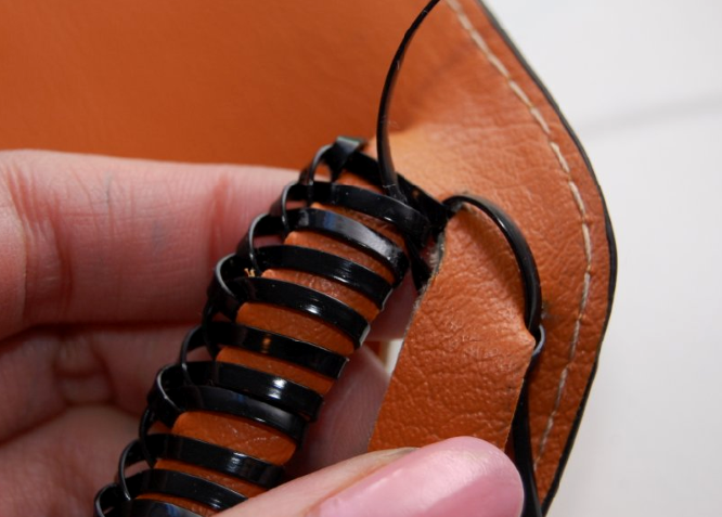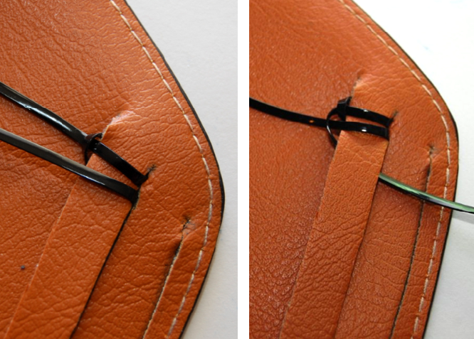 15) Except this time, before folding that strand back over the leather, weave it through the next consecutive available stitch.