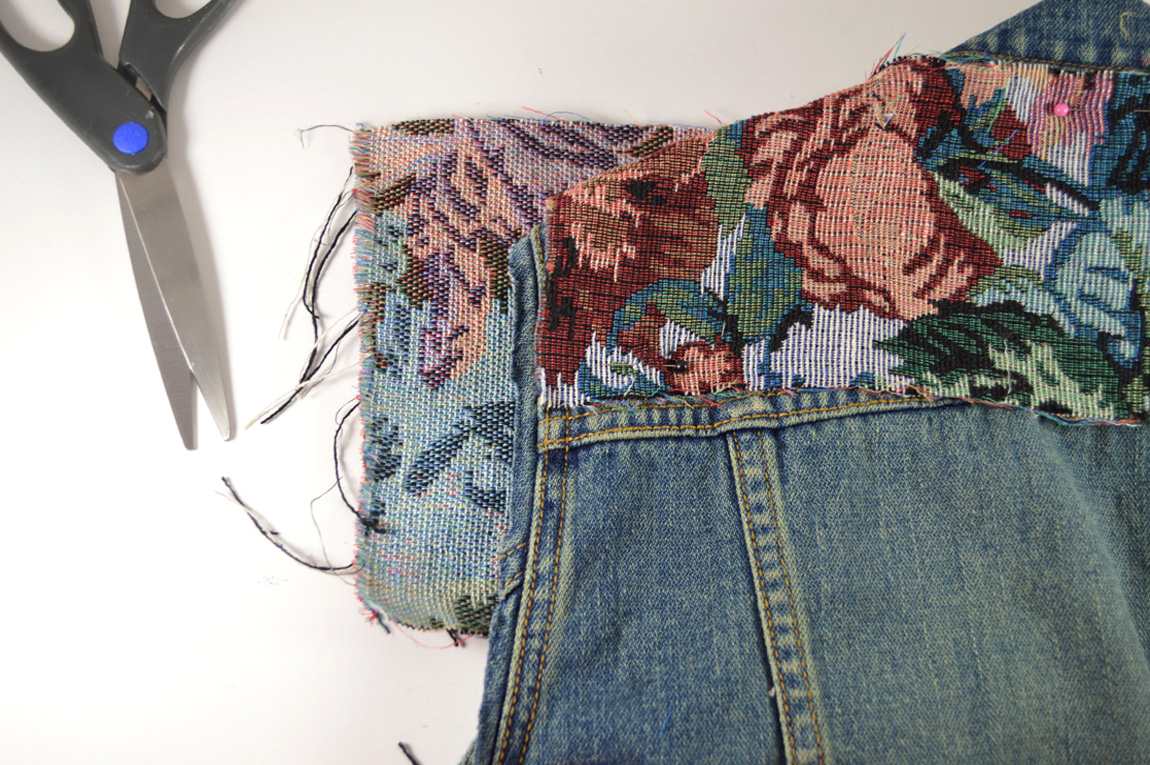 7) Lay the tapestry fabric back on the upper back panel, pinning in place. Cut the curve right under the collar, as shown above. This may be a little tricky, so take your time! If it’s not perfect, don’t stress too much – the vest’s collar will cover the cut edge of the fabric.